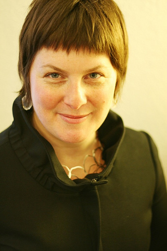 Her jacket is Theory. Note the gathering around the collar, good detail.