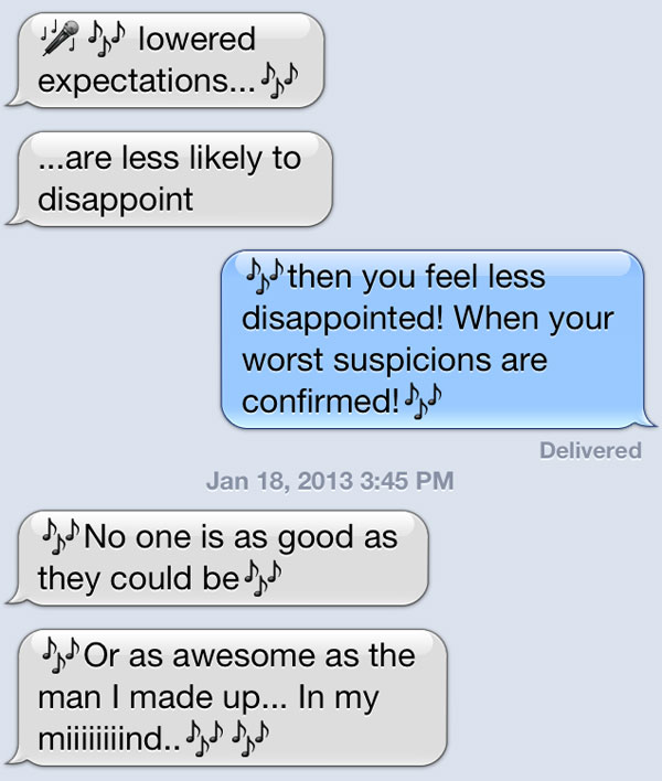 This one has a good beat, and you can dance to it. Or you can just hum it tunelessly to yourself over a cocktail. Tess is a veritable Sondheim of text messaging.