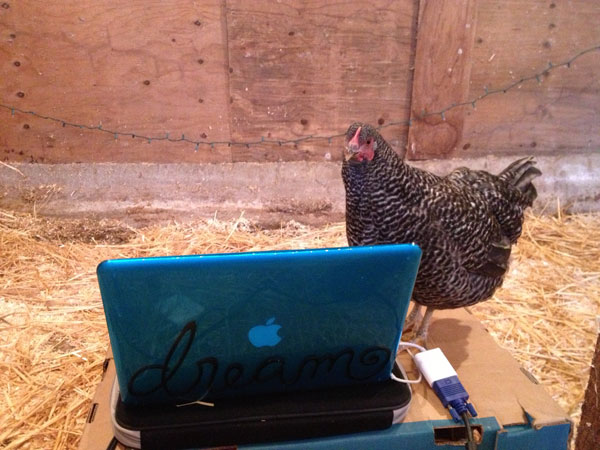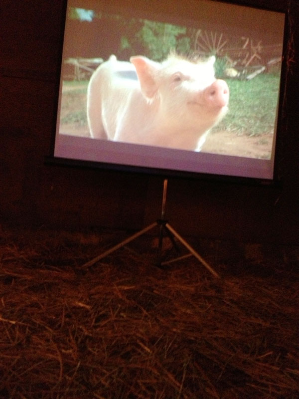 We used a laptop to the play the movie. In keeping with the farm theme, we trained a chicken to press play. I believe in going the extra mile.