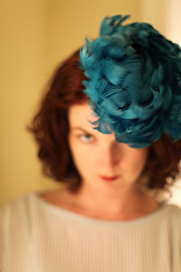 It’s super lightweight, obviously, and it travels in a tiny cardboard box because the feathers just fluff out when I open the lid. I secure it with little bobby-pin Xs, so I can wear it underneath a chignon, right on top of my head like a fascinator, or over one eye for a more vintage look.