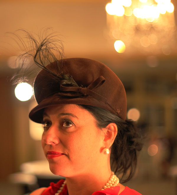 I took this of Rebecca  before we left our hotel room. She brought it with a bunch of other perfect hats to choose among. This was her grandmother’s, and it’s so well made. I wish I had a shot of the back, it looks like a completely different hat from every angle.