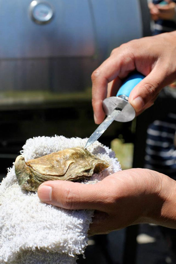 You hold the oyster in a towel or with a glove, then wedge a knife in any chink you find, preferably near the shell’s joint, but whatever. Then you wiggle the knife back and forth until you see a bit of water seeping out from the shell.