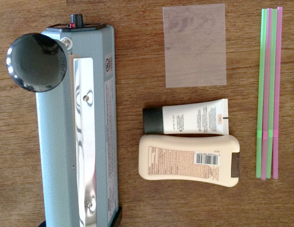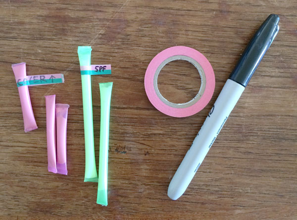 I like to label mine with tape because I find that Sharpie rubs off if I try to label the actual straw. To use the packets, you just pinch one of the ends to open, like a honey stick or plastic Pixy Stick, or if it’s stubborn you can stab it with a safety pin. I keep them in a dark place, because sunlight can get through the straw and damage things like sunscreen and makeup.