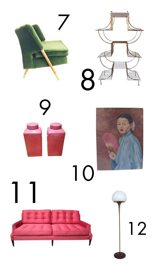 Shop for the pieces above: 1. Handblown Blue Glass Goblet 2. Henri Mathieu Moon Light 3. Soft Grey Chesterfield Sofa 4. Portrait of a Bare Shouldered Woman, Oil Painting by G. Dangman 5. Shagreen Cocktail Table 6. Midcentury Desk with Rear-Facing Bookshelf And below: 7. Mid-Century Jade Velvet Chair 8. Pagoda Plant Stand or Charging Station 9. Color-Pop Ginger Jars 10. Woman with Fan, Oil Painting by Kathryn Jenkins 11. Bachelorette Pink Linen Sofa 12. Deco Brass Floor Lamp