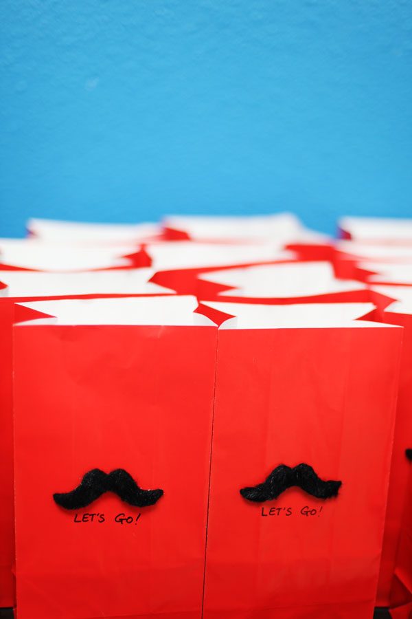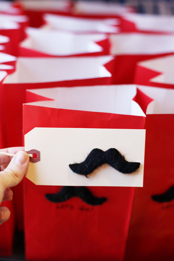 These gift bags were 30 cents each, and then I stuck on the little faux fur mustaches, which are just the ones you buy in packets for wearing on your face. I wrote on the Let’s Go! Mostly because I didn’t feel like struggling with my printer for four hours to make pro-looking labels.