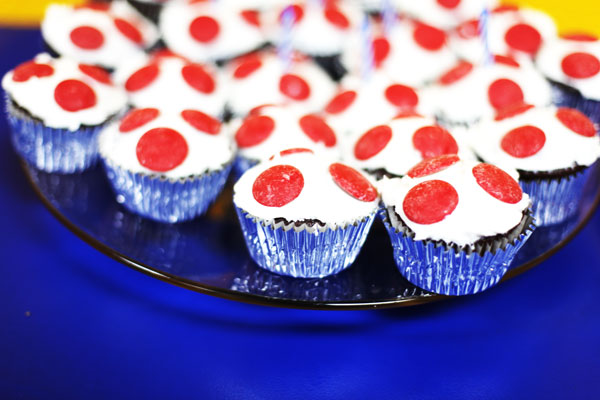 These cupcakes were crazy easy. I bought those candies you use to melt down and pour into molded trays. (If you don’t know what I’m talking about, you can get them at Michaels or most any craft store or specialty food shop.) Then I just iced the cupcakes and stuck them on for a toadstool effect. You cannot screw this up.