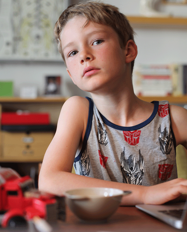 This is my 7-year-old child craning his neck to see what’s on the television screen I’m watching, while he plays on my laptop.