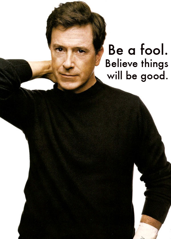 I heard Stephen Colbert say this on Oprah’s Next Chapter, and found it striking. I agree, but “better to be hurt” is so rough to put into practice. Do you think cynicism can be a function of wisdom? Where do you find yourself on the jaded spectrum?
