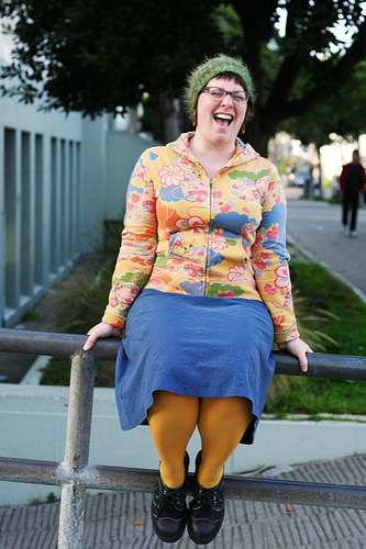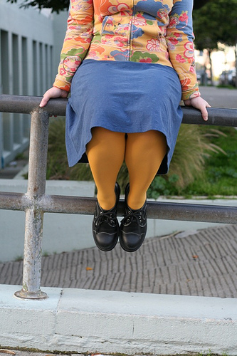 Her skirt is by Texture Clothing, purchased at the Renegade Craft Fair. Her gold tights are from Hue.