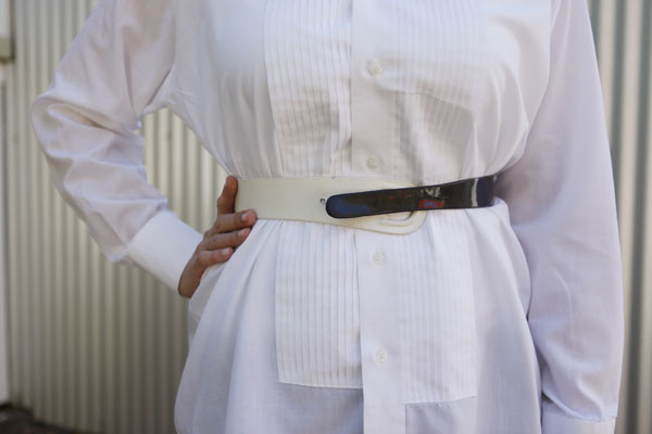 The vintage men’s tuxedo shirt is from a vintage shop on 16th Street. I love it. Belt is also vintage.