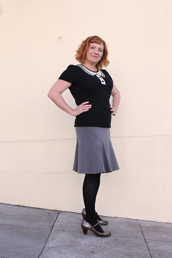 This is a little more of a San Francisco outfit. Something I would wear to do a trend presentation or seminar, or meet up for dinner with folks to discuss the future of ladies neck ties, or the influence of the corset in modern day. If I weren’t pregnant, I’d wear this with a tight denim vest.