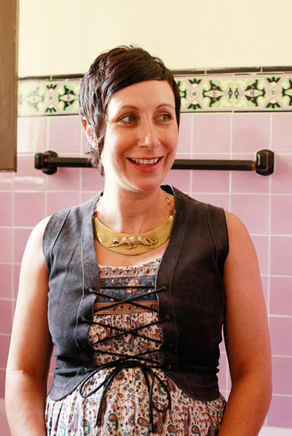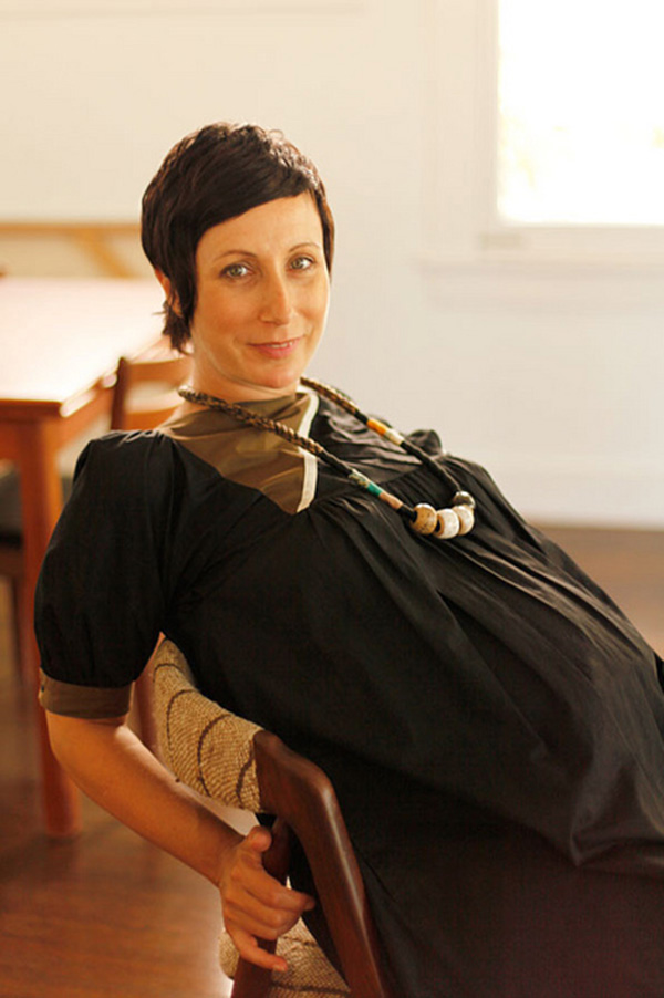 Here’s Liz with a pillow she probably whipped up in the ten minutes before she had a dozen guests over for dinner. Liz, I will pay you to be my wife. Tights by American Apparel, brown boots are Diesel from a consignment store, and the gray dress is H&M.
