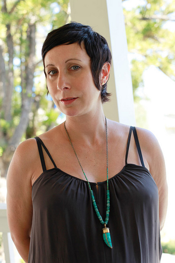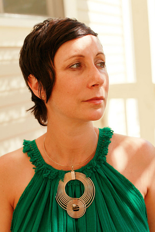 Her T-shirt is Old Navy, and the Pop-Out pendant is by Melissa Borrell Design. It’s from Rare Device.