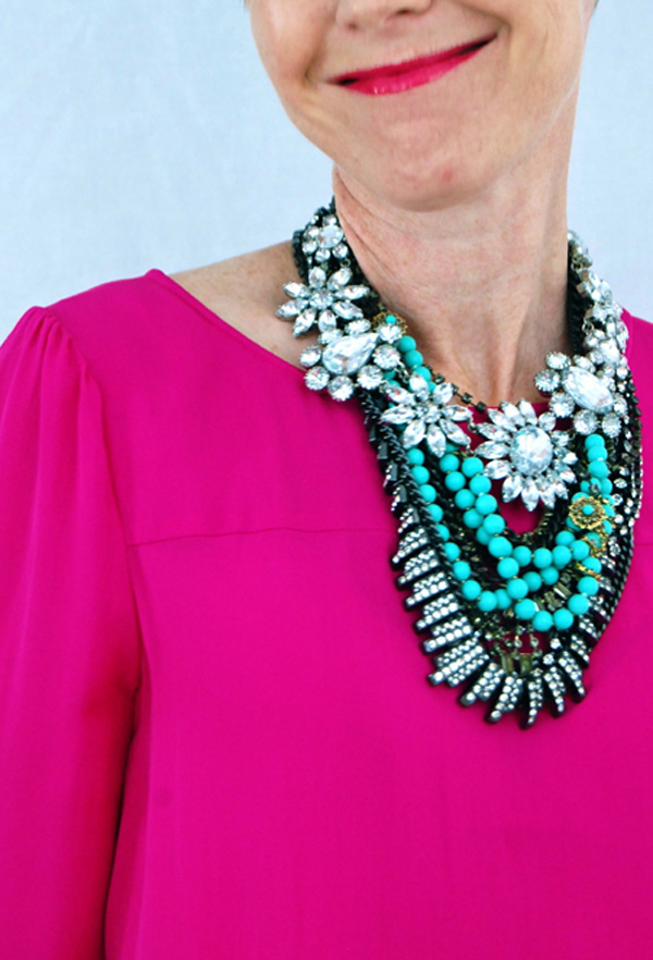My grandmother’s pearls are special-occasion jewelry; this dress works equally well with something chunky and modern.