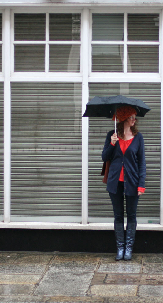 Did you think I was kidding about wearing things over and over? Hey look, it’s that same chambray shirt! Back again! I also own this skirt in four different colors — navy, pink, and khaki linen/cotton for summer, and purple wool for winter — and I wear it almost constantly, in one iteration or another. (Ed note: If you recognize the skirt, you might have seen Susan recommend it in Wardrobe Basics for Real Women a while back.) And hey, it’s that same belt from before! And the same shoes. Go figure.
