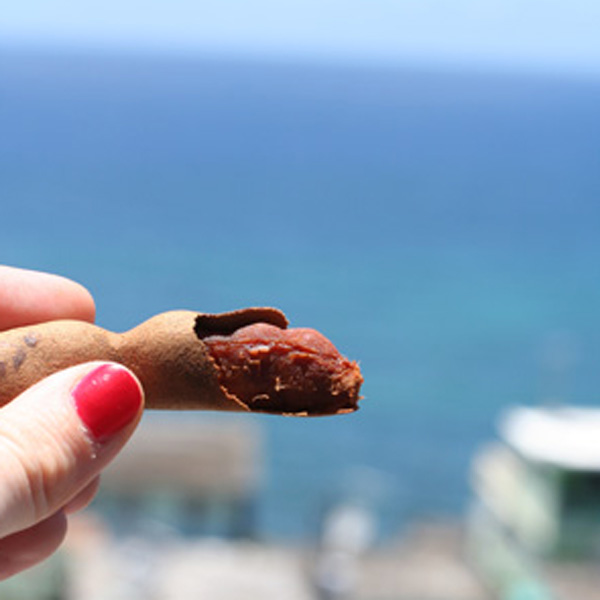 Tamarind grows in a hard pod with paste-like brown fruit around its seeds. It doesn’t look particularly appetizing. The fruit is very sour, but not like a lemon, there’s sweetness there too. It tastes almost like Crystal Light powder, but less chemical of course. You suck the fruit away from the seeds.
