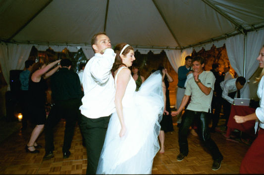 I changed into one of those horrifying velour tracksuits that was very popular at the time, and one of our groomsmen remarked that I looked like a movie star trying to go incognito. Mostly I just wanted a zip-front something to wear all day so I could change out of it without ruining my hair and makeup. Also I might have wanted to practice a cheerleading routine or something. You never know.